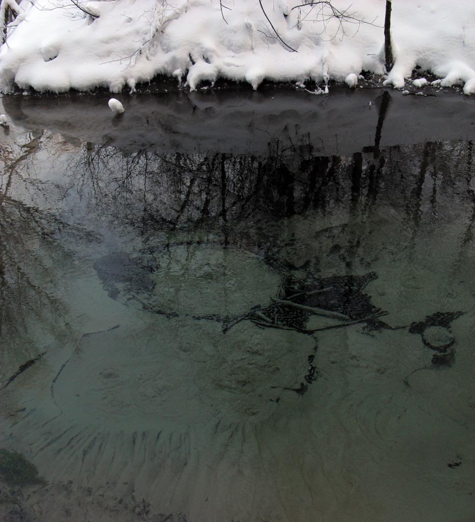 ) ). Без приключений добираюсь до санатория. Цель - посетить самые баянистые места данной местности. Сначала - Илеть и Зелёный ключ. На воротах санатория висит "кирпич". Приходиться объезжать по пробитой недавно в свежевыпавшем снеге колее. Вскоре колея выводит на прочищенную трактором, ведущую вниз дорогу. Вот и площадка у ключа, возле которого бродит народ пенсионного и предпенсионного возраста, набирая воду. Прохожу вдоль берега Илети. Вода парит на морозе. Подальше, в излучине, плавают утки. Подпускают к себе поближе, но на жужжание выезжающего объектива фотоаппарата реагируют нервно - часть пытается улететь, остальные спешно уплывают подальше. Возвращаюсь к ключу. Вода выходит из подножия горы. Дно кажется зеленоватым. Пройдя чуть дальше, по тропе, обнаруживаются т.н. "поющие ключи", бъющие из дна песочными гейзерочками.