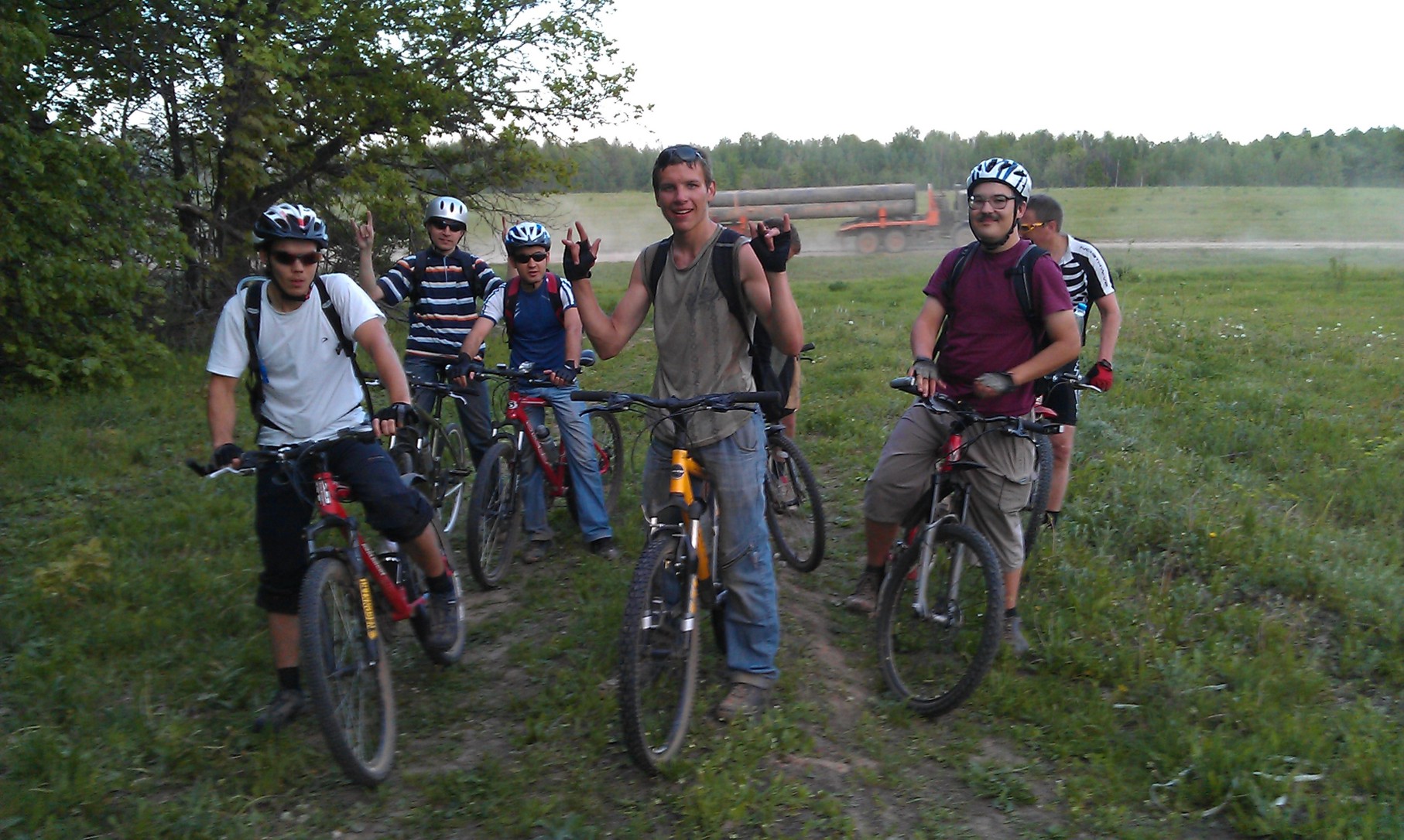 Собралось человек восемь, покатили асфальтом через Царицыно. После умеренного асфальтового подъема начался отличный длинный и гладкий грунтовый спуск с веселыми виражами и постепенно увеличивающимся наклоном, который вывел нас на север от поселка Аки. Промахнулись маленько :roll: Грунтовками мимо насыпи недостроенной ЖД выбрались к Чебаксинскому озеру, там, кстати, все уже начинает заростать, кое-где пришлось таранить виящие ветки. Дальше полезли вверх к Мамадышскому тракту по грунтовке, покрытой сантиметровым слоем пыльной пудры - привет, верблюдинг. Переехали трассу, дальше дорога потихоньку пошла на спуск, правда сначала немного колбасило. Доезжаем до опушки леса, и тут начинается экшн. Сначала разгоняемся вдоль опушки, грунтовка вниз, немного разбитая, но под 30 катится нормально. Дальше ныряем в просеку, километровый крутой спуск по абсолютно гладкой грунтовке с небольшими виляниями туда-сюда. На велокомп не смотрел, Lennik разгонялся до 47км/ч. Следом был длинный трейловый спуск по лесной дорожке с веселыми поворотами и умеренным уклоном, катилось по нему просто классно! Ну и напоследок проехали по разбитой тропке через деревянный мосток через Ноксу и грунтовками вышли на Минскую.