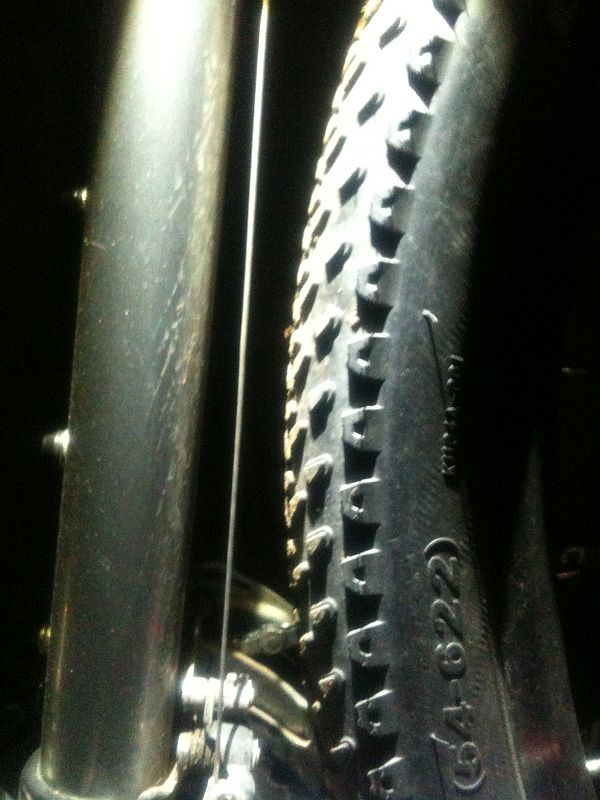 А вот с задним колесом дела не так хороши,-крыло "обгрызок" снабженное самодельными лямками из спиц защищает только спину от брызг ,подседельная -же труба остается в грязевых брызгах...Но может быть и х. с ней?