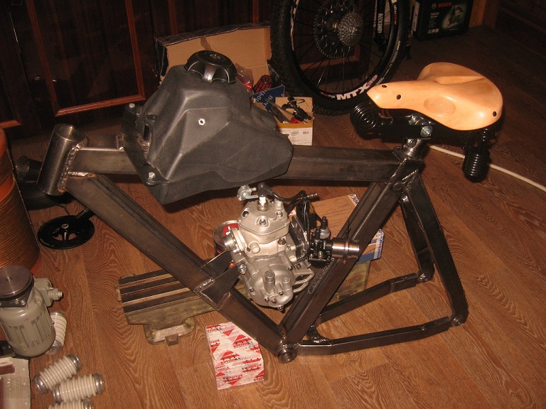 Выдержит, смотря какой мотор конечно. Хотя, даже тот, что будет стоять в этом проекте, обладающий чудовищной мощностью в 12 л.с., развивает эту мощность только на огромных оборотах, не ниже 12-14 тыс. А значит, крутящий момент тоже выдаётся на оборотах выше 10 тыс. На практике, использовали даже стандартную 9ск велотрансмиссию. Но конечно, вопросы по ресурсу. Планетарку вполне себе используют с теми же КД или триммерными двигателями, они имхо, более живучи вследствии своей конструкции (чахлая 9ск велоцепь очень быстро растянется, а потом и порвётся от дичайшей мощности движка). Тут же конструкция проверенная временем. Одна скорость, а вот вело-часть будет иметь кассету на 9ск, и переключатель с манеткой. Ибо вес уже немаленький будет (не менее 45кг). Что, впрочем, тоже не так много, как могло быть.